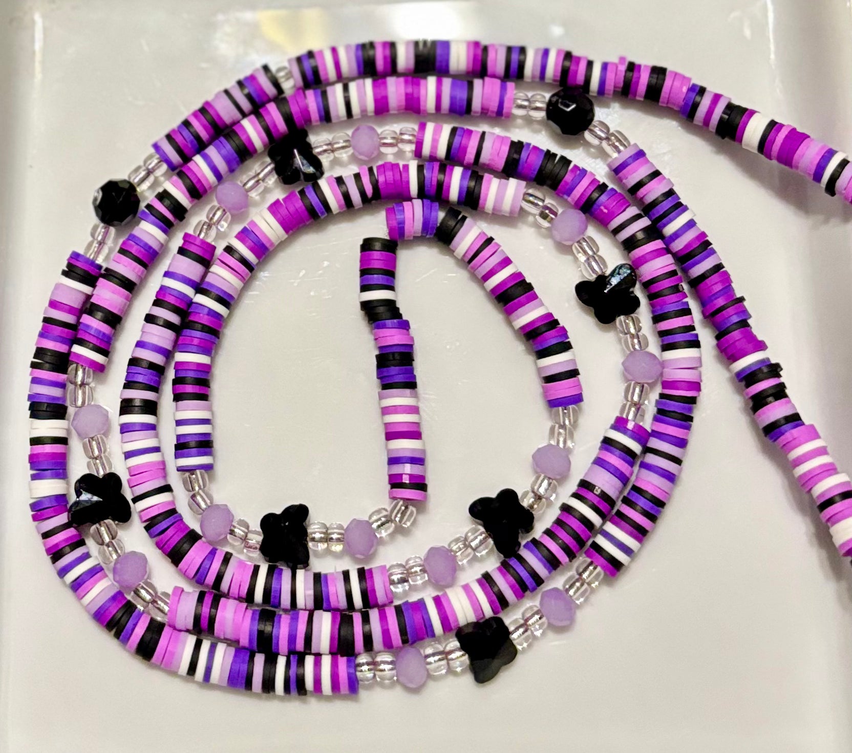 Amber Essence is the heart of the Amberfly: Wings of Us collection—a strand that celebrates the sacred bond between best friends and the beauty of becoming. Featuring butterfly charms that symbolize transformation and freedom, this waistbead blends soft lilac, blush pink, and grounding black in a rhythmic pattern that feels like a heartbeat shared between souls.